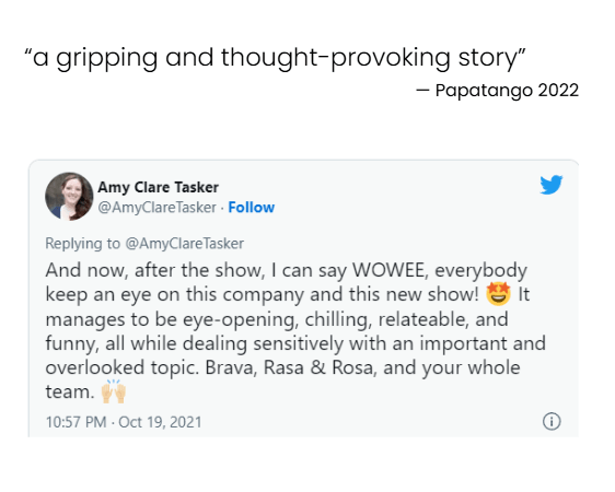 It is STIGMAcollective’s most ambitious show to date. It has received support from VOILA! Europe and The Cockpit Theatre and its R&D process is supported by Arts Council England.
